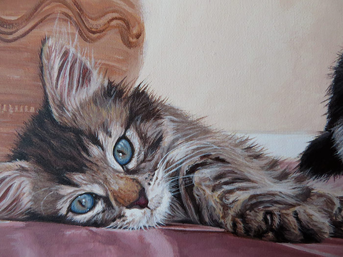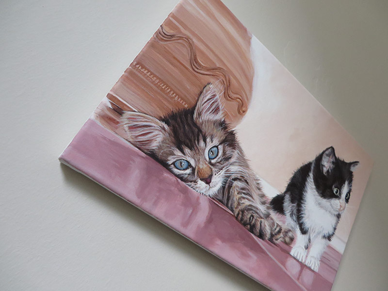 This is a painting I completed before Christmas. It was commissioned as a Christmas gift. The kittens in the portrait are Sebastian, the tabby kitten and Belle, the black and white kitten. I worked from two separate reference photographs provided by the client. I placed both cats into one composition with some simple shading, using mostly the background from Sebastian’s photo.