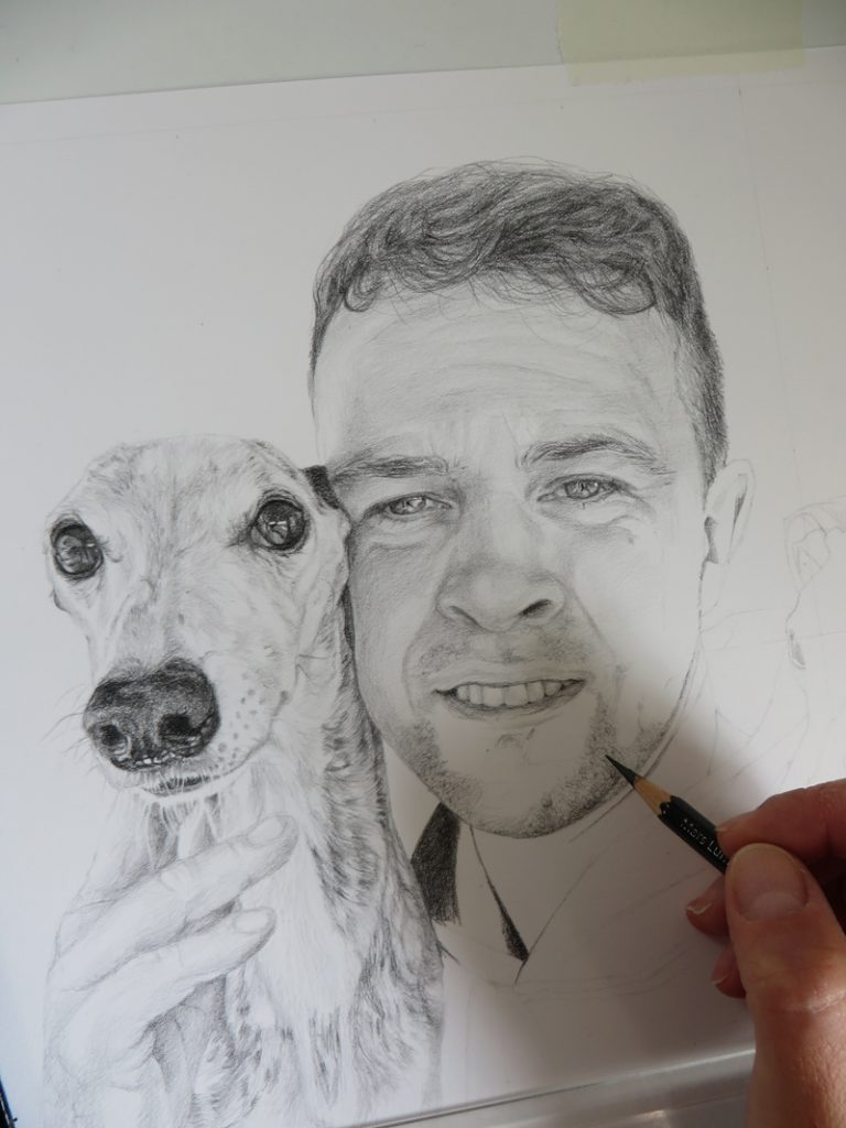 I worked on Killian’s portrait last year. It was commissioned as a present from his fiancee. He just loves his dogs, one of whom passed away last year. My client Lauren wanted me to capture all three dogs with Killian…