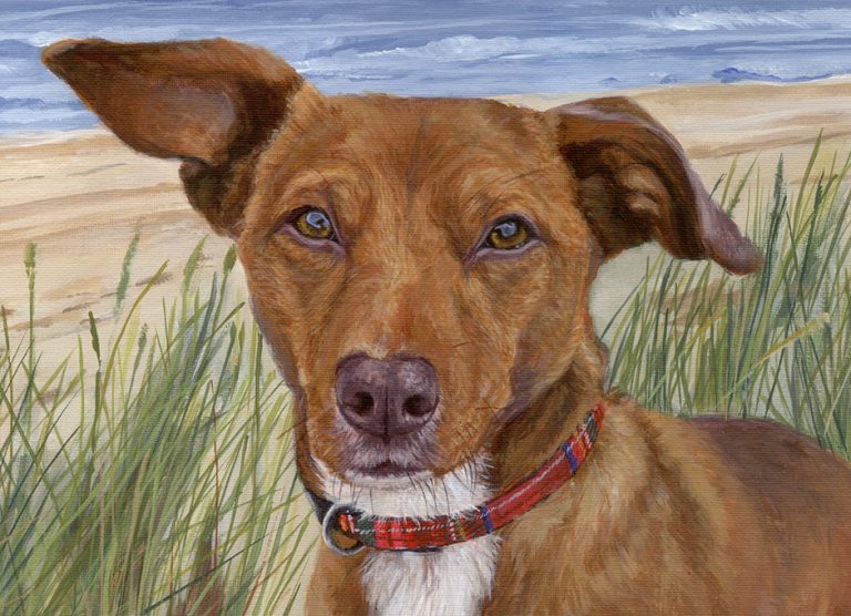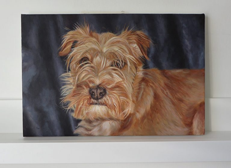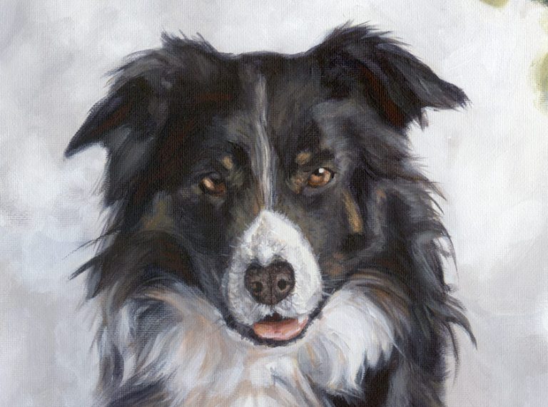 This is an acrylic painting of a collie called Theo and a pomeranian cross Jess. It was commissioned as a 40th birthday present for my client’s wife. I painted their dogs’ portrait in May this year. The client wanted the…