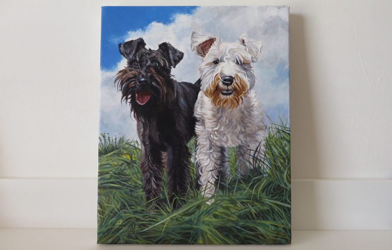 This is the latest dog portrait I worked on this summer. It is of two gorgeous schnauzers standing on a hill. Balhu is the black one and Albus is the white one. I just loved the reference photo, the setting…
