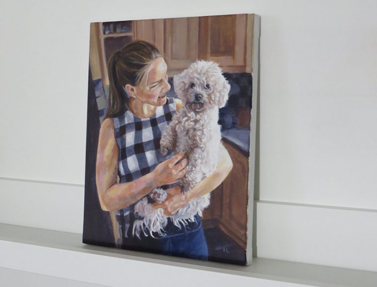 This portrait was commissioned as a Christmas present for the girl in the painting. It was commissioned by her boyfriend. She is holding her lovely bichon frise in their kitchen. The reference was quite dark and I brightened it a…