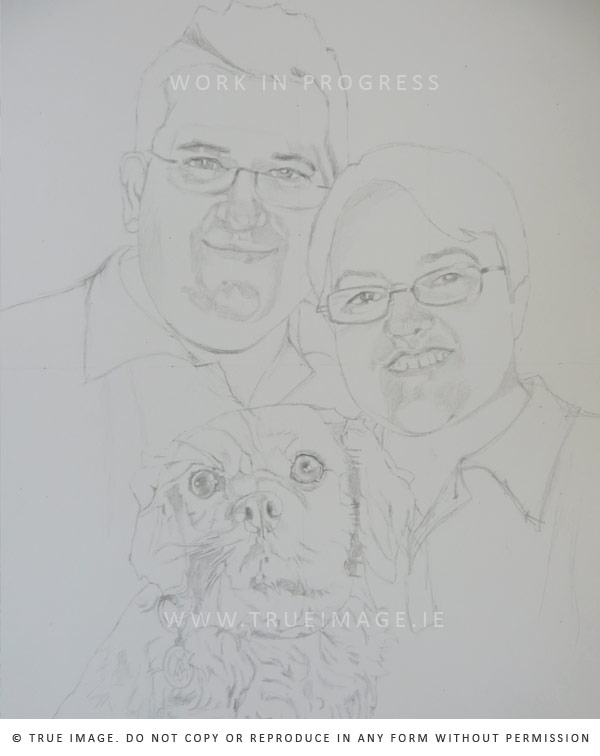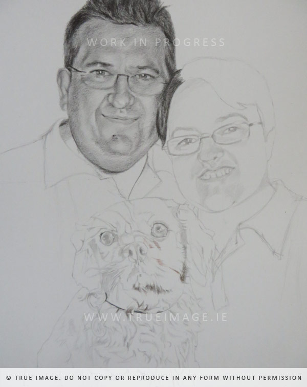I have just finished working on another portrait. It is a family portrait of a cocker spaniel called Charlie and her owners. Charlie has sadly passed away and her owners wanted a portrait of her and themselves as a keepsake. To put Charlie into focus, we have decided to draw her portrait with tinted pencils and the rest of the portrait in graphite. I think it worked out quite well. Charlie’s reference photo was pretty good so I could really go to town with all the detail. It was such a lovely portrait to work on. The drawing is 25 x 30cm (10 x 12 inches) in size and I will be posting it in a lovely neutral mount. Below, I am posting a scan of the drawing together with some progress pictures for those who are interested in how I got there. For the graphite pencil portrait, I used Staedtler Mars Lumograph pencils (so hard to get in Ireland), and for the tinted portrait of Charlie, I used Faber Castell Polychromas which are just lovely to work with. I used burnt umber, yellow ochre, walnut brown, burnt sienna and venetian red.
