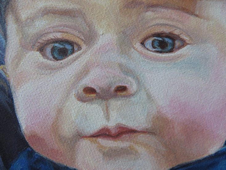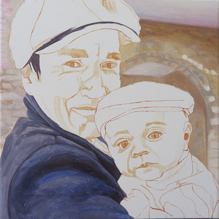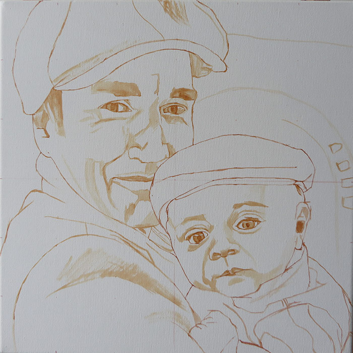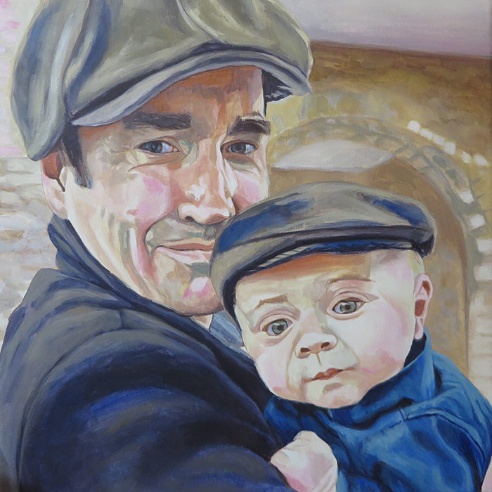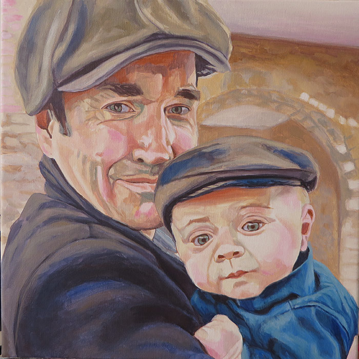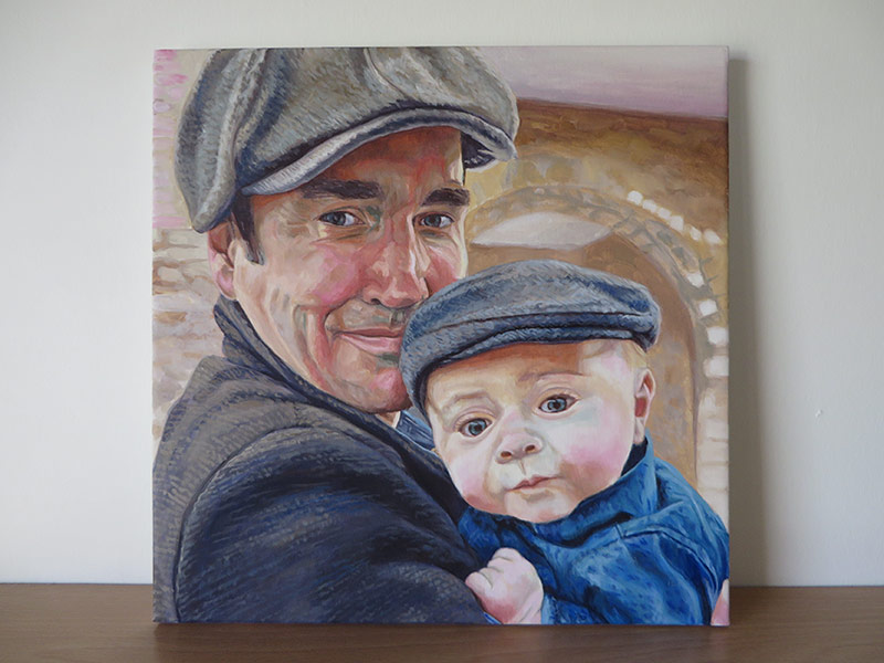This painting is a 30 x 30 cm portrait of a dad with his baby boy. The client commissioned this portrait as a present for the father in the picture. I worked from a lovely reference photo with some lovely rich colours and I wanted to translate this in the painting. I tried to balance the warm red tones with some some cool greens. The client was very happy with the painting a wrote me a lovely email: