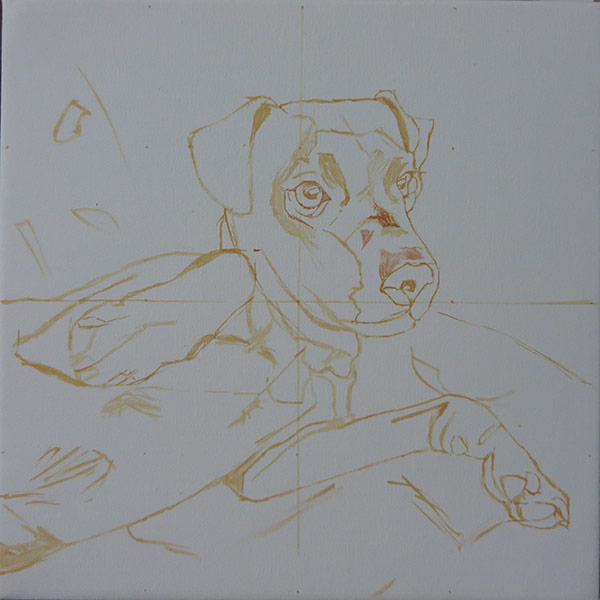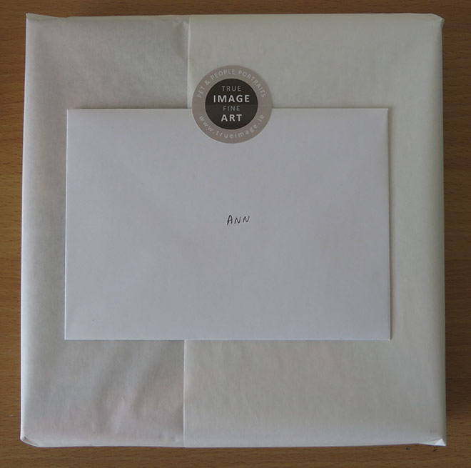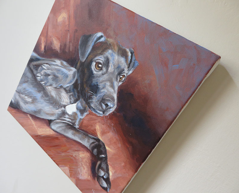 This was a small acrylic painting of Joey who was sadly hit by a car. He is missed very much by his owner who just celebrated her birthday last week. Her daughter commissioned this portrait as a keepsake for her mum. The client was travelling abroad at the time of her mum’s birthday so she asked me to send the painting directly to her mum with a little card. I took a picture of the wrapped painting and you can see it below together with some work-in-progress photos.