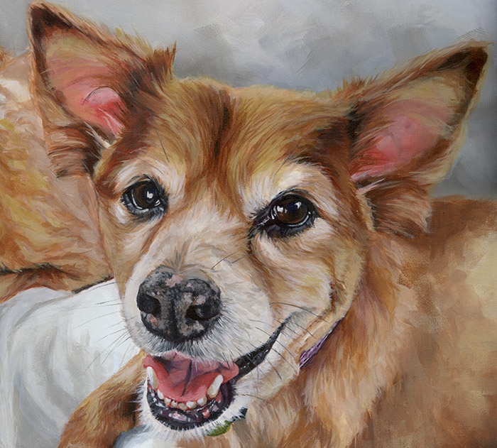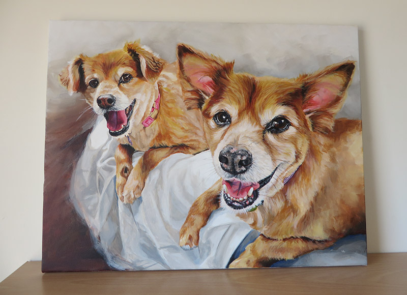 This a painting of Lola and Bear, two lovely pomeranian crosses. Lola is 13 years old and Bear is 12. Bear was the last puppy of Lola’s last litter. The client commissioned this portrait for her boyfriend who just loves them both. It was a present for his big birthday.