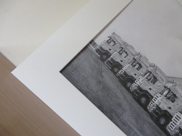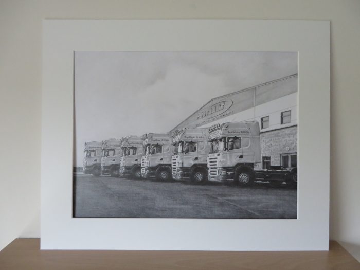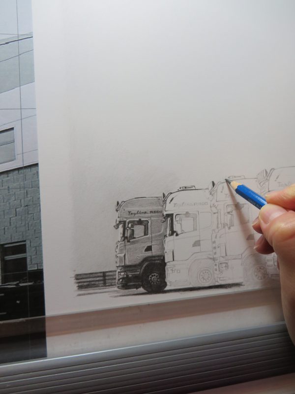 I completed this drawing one week ago after working on it for two weeks. It was a very different commission for me. I had never drawn trucks before… The drawing is 30 x 40 cm in size and features six trucks parked in an interesting pattern outside the Protrans offices. The drawing was commissioned by the company owners as a way of celebrating twenty years in business. I worked with Staedtler graphite pencils on Fabriano paper.