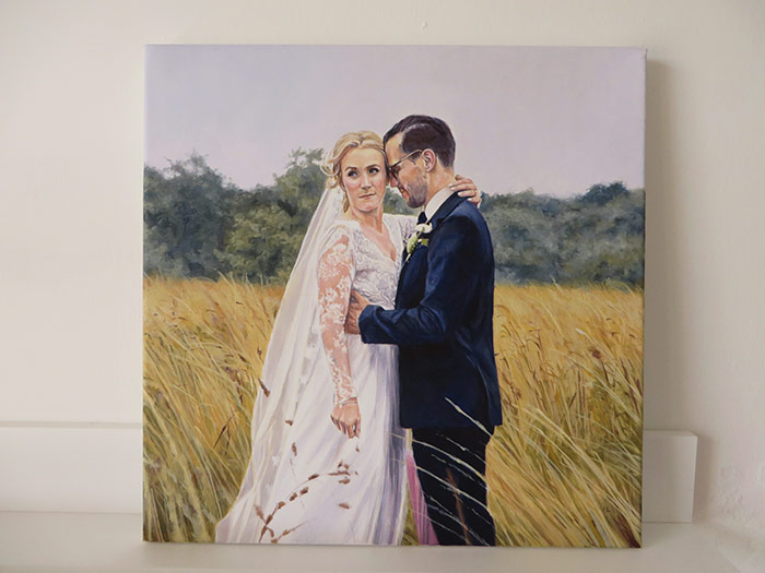 This is a 30 x 30 cm wedding painting. I worked on the portrait in September. It was commissioned as a wedding present for the couple in the picture. I loved the setting of the photo, the colours work really well. I had a few photographs to work from for the portrait. I used acrylic on stretched fine grain cotton canvas. The client was very pleased with the finished painting. I took some photos that I am including together with the scan.