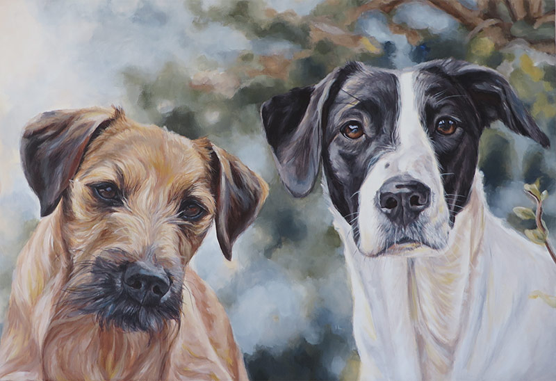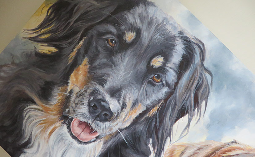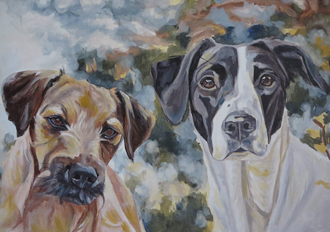 This is a painting I worked on in January for a return client. I created a drawing of three of her dogs a year ago and since then the client rescued Socks. She wanted to include him in the portrait too and asked me to create an acrylic painting this time. The photos she gave me were excellent and it was a pleasure to create this painting. I worked in a wide landscape format of 30 x 90 cm, on stretched fine grain canvas. I used acrylic paints, working with only a few colours for harmony. The dogs are from left to right, Buster the collie, Holly the beagle, Casey the terrier and Socks the shorthaired pointer.
