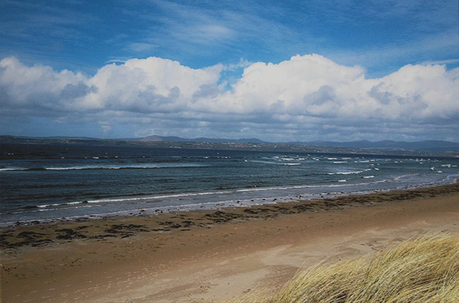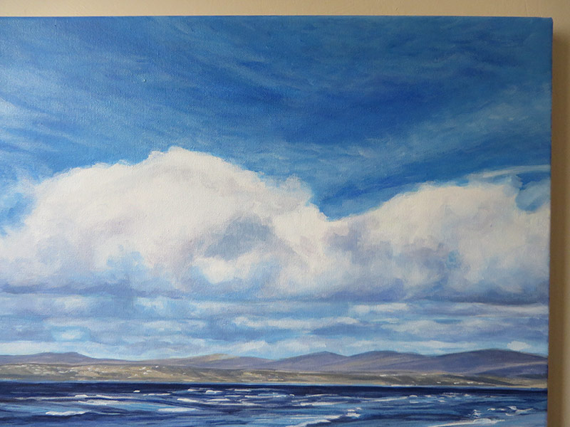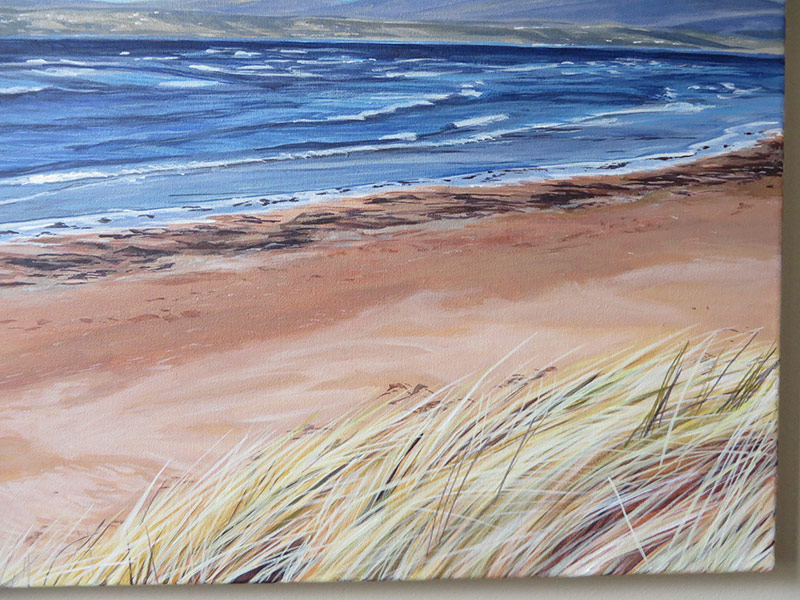 This painting was commissioned as a birthday present for the client’s wife. Tom asked me to recreate a photograph of his wife’s favourite spot, Rossnowlagh Beach in county Donegal. The painting was 40 x 60 cm in size and painted with acrylics on fine grade stretched cotton canvas. There was a lot of detail in the photograph which gave me a lot to work with. I wanted to capture the vastness of the beach and create some depth with the mountains in the distance. I worked in a few thin layers of paint. The client collected the painting on his way home from a trip abroad. He was very happy with the finished painting and sent me a lovely email: