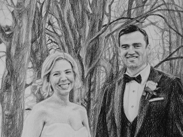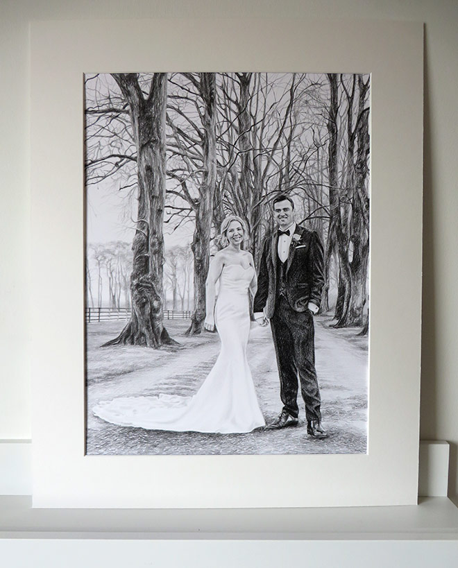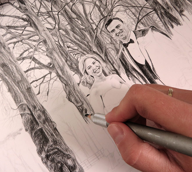 This drawing is 30 x 40cm in size and drawn with graphite pencils on paper. I use mostly Staedtler pencils on Fabriano paper with cotton. I use a HB pencil to sketch the initial portrait and then work with 2B, 4B and 6B pencils. This was an interesting project with a lot of detail, including in the background. The photograph missed some detail so it was challenging to capture the bride and groom’s faces at such small scale, but the client was happy with the finished portrait.
