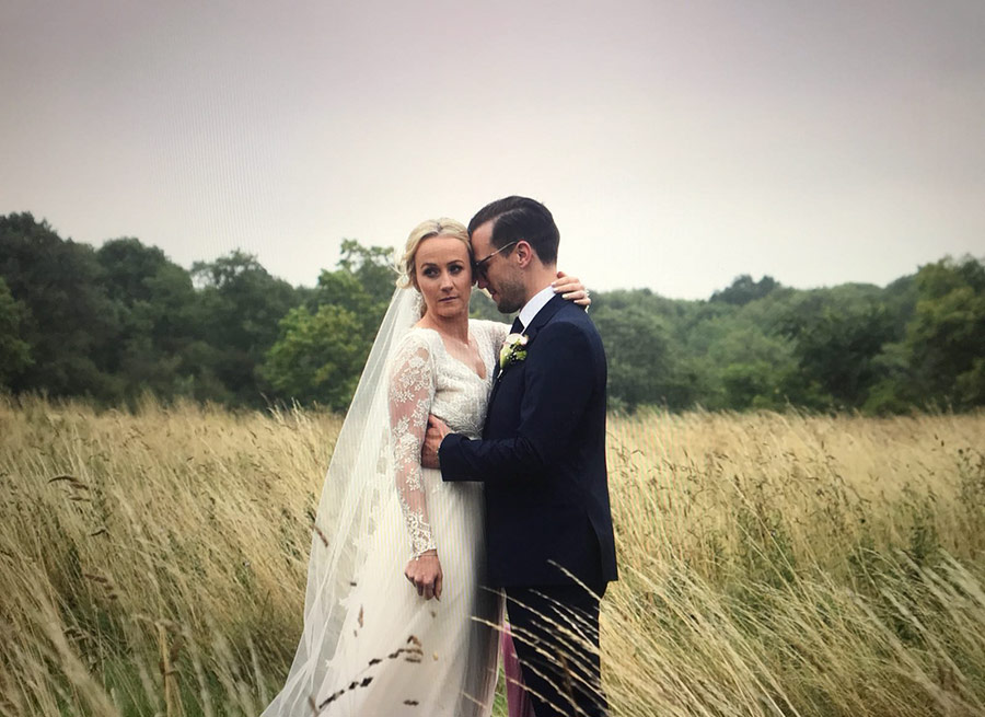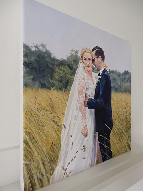 This is a 30 x 30 cm wedding painting. I worked on the portrait in September. It was commissioned as a wedding present for the couple in the picture. I loved the setting of the photo, the colours work really well. I had a few photographs to work from for the portrait. I used acrylic on stretched fine grain cotton canvas. The client was very pleased with the finished painting. I took some photos that I am including together with the scan.