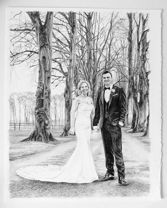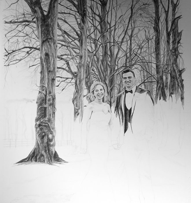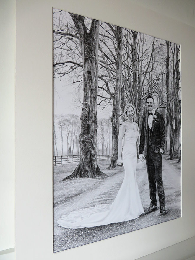 This drawing is 30 x 40cm in size and drawn with graphite pencils on paper. I use mostly Staedtler pencils on Fabriano paper with cotton. I use a HB pencil to sketch the initial portrait and then work with 2B, 4B and 6B pencils. This was an interesting project with a lot of detail, including in the background. The photograph missed some detail so it was challenging to capture the bride and groom’s faces at such small scale, but the client was happy with the finished portrait.