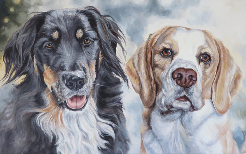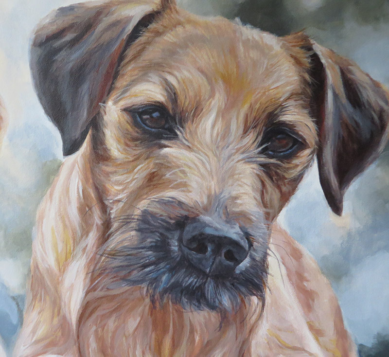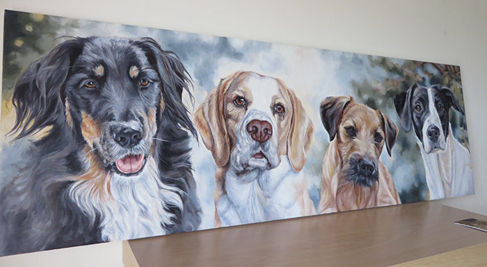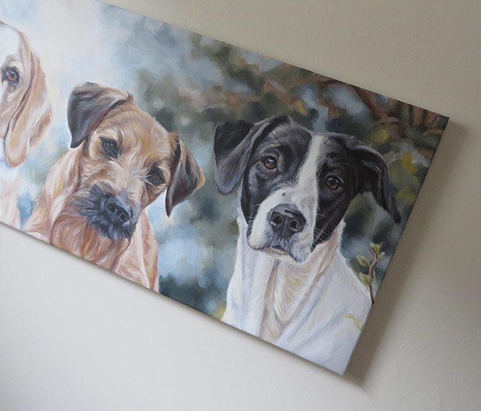 This is a painting I worked on in January for a return client. I created a drawing of three of her dogs a year ago and since then the client rescued Socks. She wanted to include him in the portrait too and asked me to create an acrylic painting this time. The photos she gave me were excellent and it was a pleasure to create this painting. I worked in a wide landscape format of 30 x 90 cm, on stretched fine grain canvas. I used acrylic paints, working with only a few colours for harmony. The dogs are from left to right, Buster the collie, Holly the beagle, Casey the terrier and Socks the shorthaired pointer.