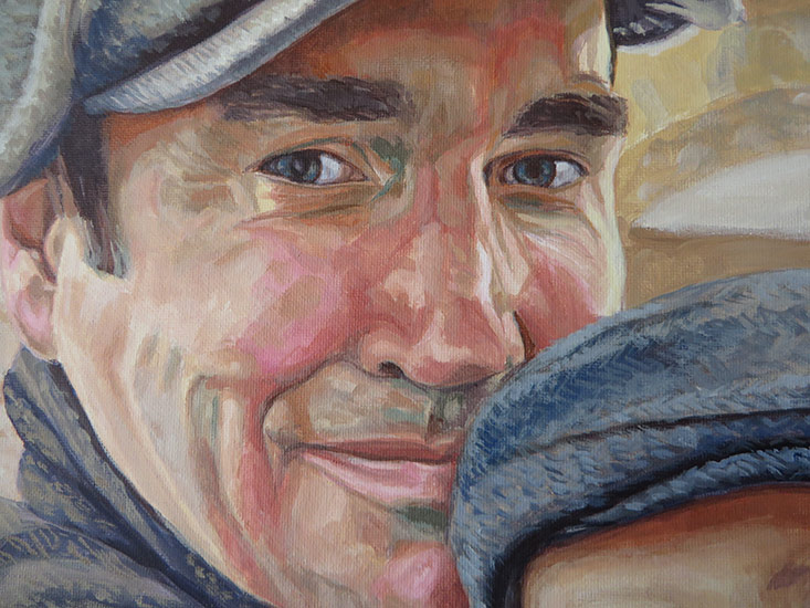 This painting is a 30 x 30 cm portrait of a dad with his baby boy. The client commissioned this portrait as a present for the father in the picture. I worked from a lovely reference photo with some lovely rich colours and I wanted to translate this in the painting. I tried to balance the warm red tones with some some cool greens. The client was very happy with the painting a wrote me a lovely email: