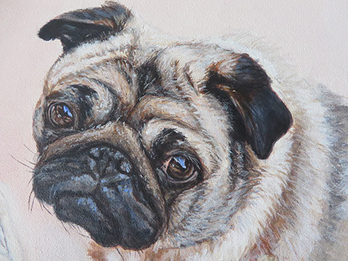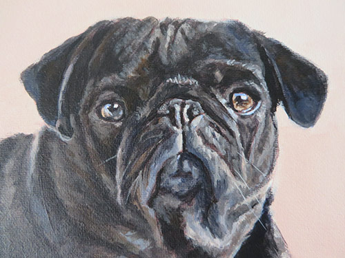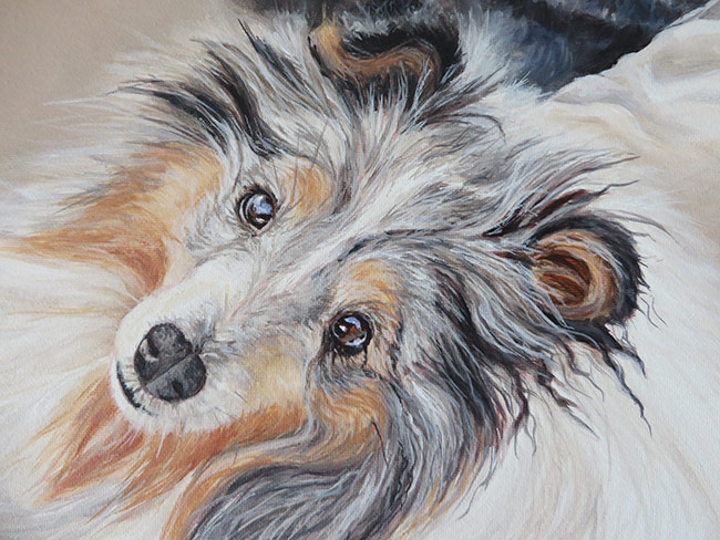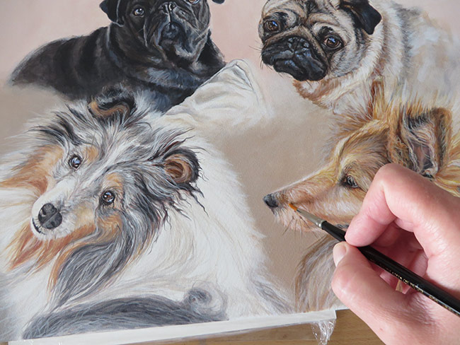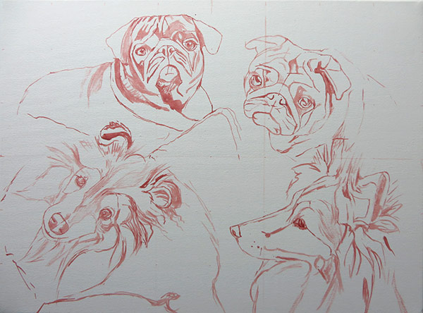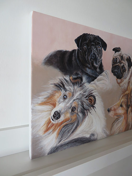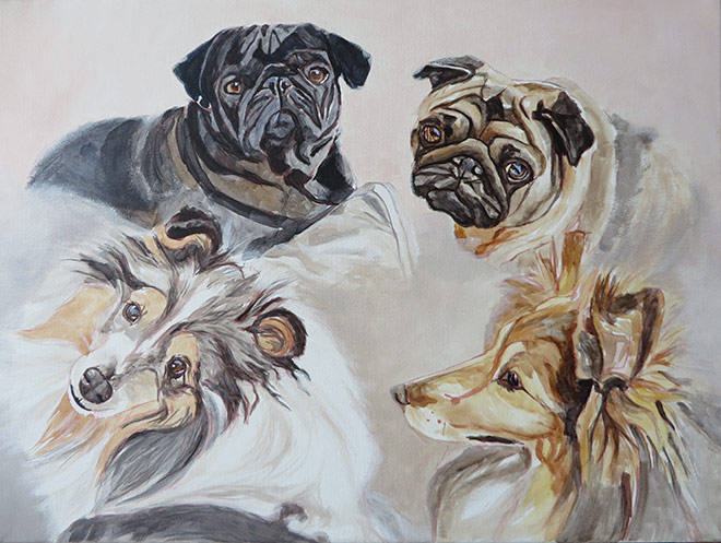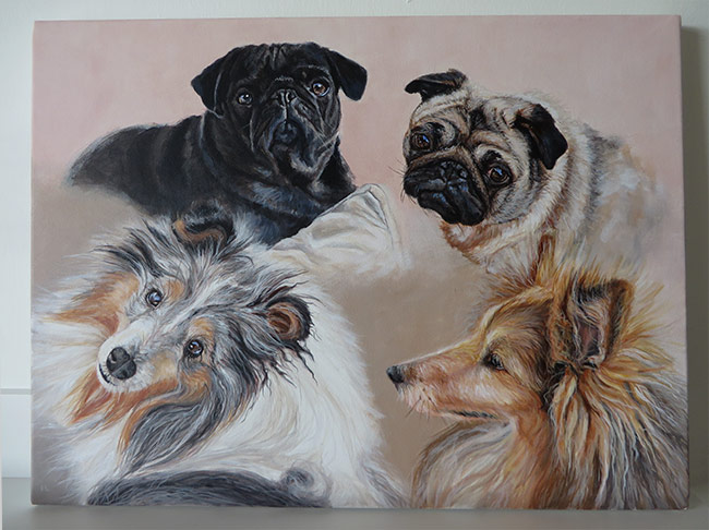 This is a portrait I worked on back in August. I am still playing catch-up with my blog 🙂 The painting is 30 x 40 cm in size painted with acrylics on stretched canvas. It was commissioned by a return client. The painting was a gift to the clients’ friends who she was visiting in France. I worked from four reference photographs that I am including below. The client was very pleased with the finished painting. It was a lovely painting to work on, the dogs being so different. We opted for a montage type composition with a simple shaded background.