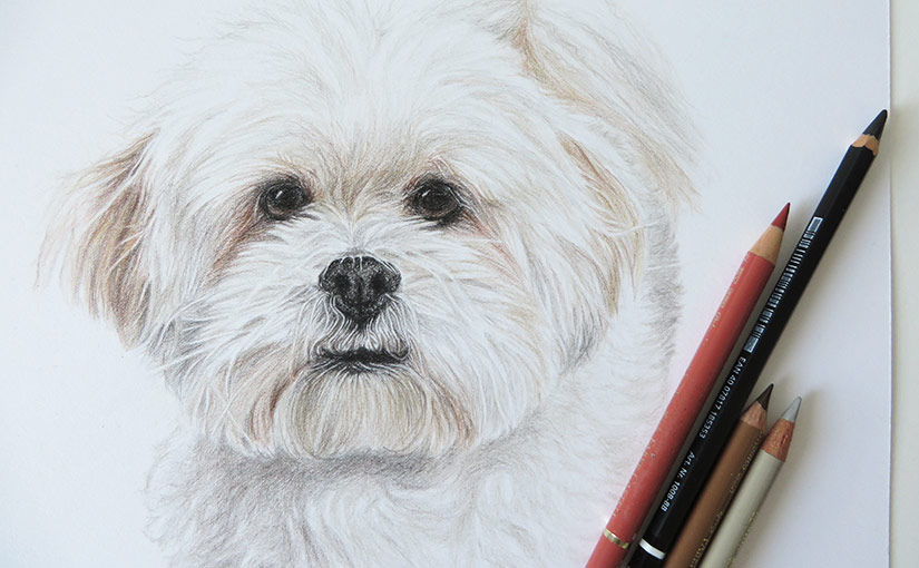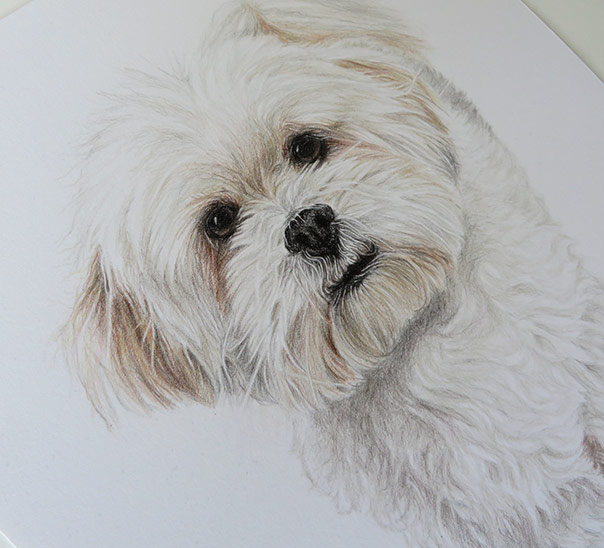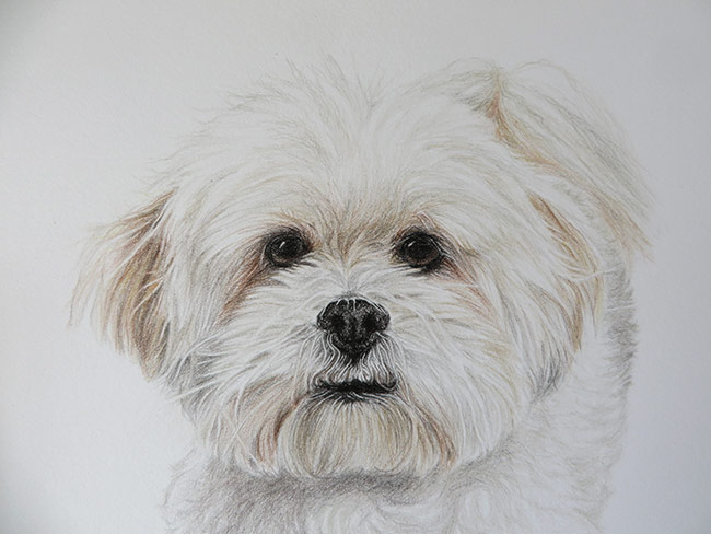 This is a portrait of a lovely bichon dog called Harry. The client commissioned his portrait as a present for her sister and her fiancee, Harry’s owners. The portrait is 25 x 30 cm in size and it is a coloured pencil drawing. The client wanted me to capture Harry’s soft colouring. She described him as a very cute and placid dog and I wanted to show this by making the overall portrait soft.