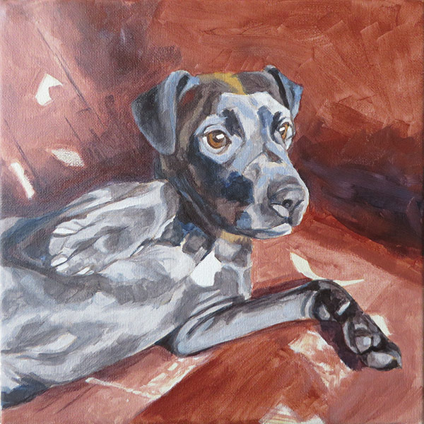 The painting was the smallest size I work in, a 20 x 20 cm, painted with acrylics on stretched canvas. I simplified the background and added some red and blue shading to compliment Joey.