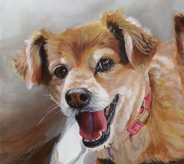 This a painting of Lola and Bear, two lovely pomeranian crosses. Lola is 13 years old and Bear is 12. Bear was the last puppy of Lola’s last litter. The client commissioned this portrait for her boyfriend who just loves them both. It was a present for his big birthday.
