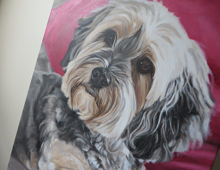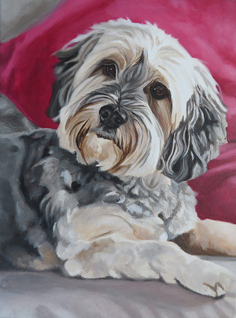 This is Mini, the yorkshire terrier. I worked on her portrait just a week ago. The client commissioned this painting as a Christmas present for his wife. I loved the photograph the client provided for this portrait. The red cushion in the background added a lovely warm contrast to the whites and greys of Mini’s fur. I detailed Mini’s head and worked the rest of the painting more loosely. The painting was 30 x 40 cm in size and painted with acrylics on stretched canvas.