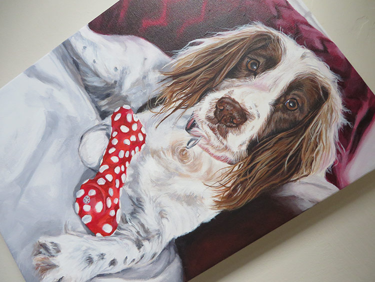 Molly’s painting was commissioned as a birthday present for the client’s daughter. Molly has a damaged leg and keeps it folded when sitting. The client was very keen to show this in the portrait together with her squeaky toy bone. This brought a lovely splash of colour into the painting. The red blanket behind Molly tied it all together. I worked from several reference photos which was great as I could really capture Molly’s colouring and expression.