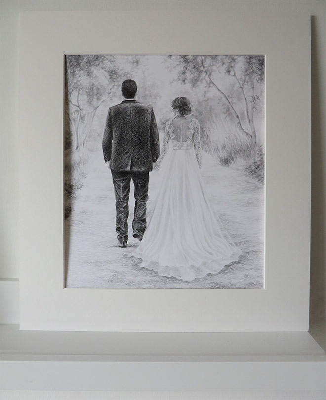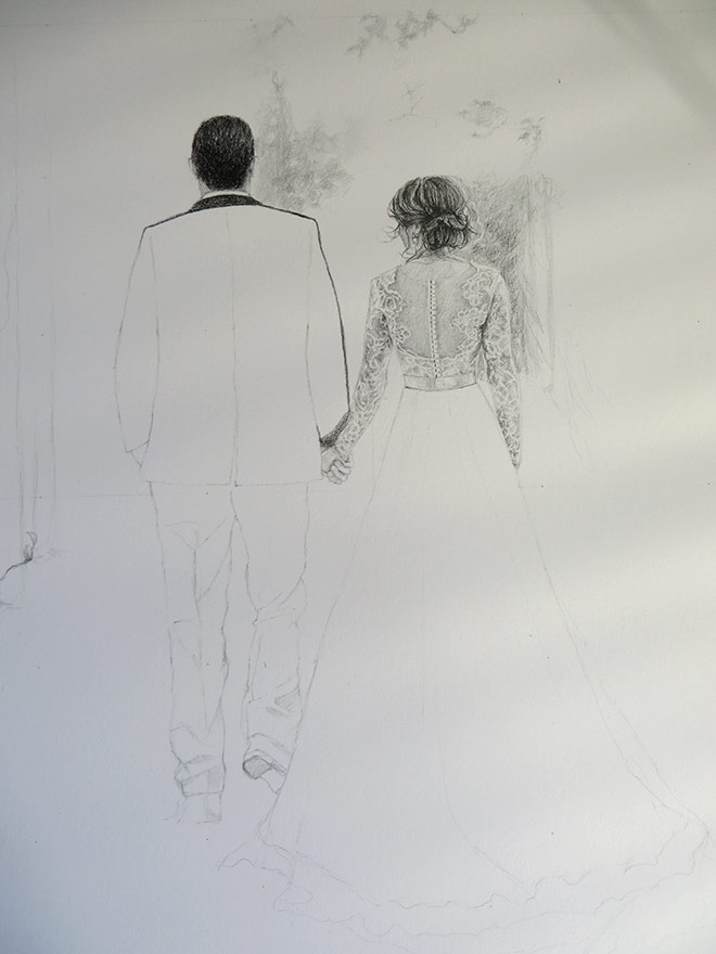 This was an unusual commission I worked on a couple of months ago. The client asked me to create a drawing of her sister and her husband on their wedding day. She wanted me to capture them walking away specially to show the back of her sister’s wedding dress because she didn’t have a professional photo taken of it on the day. The client provided me numerous photographs of the couple which I pieced together to create a drawing. The portrait was 25 x 30 cm in size and drawn with graphite pencils. I included some trees in the background.