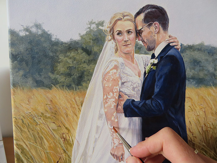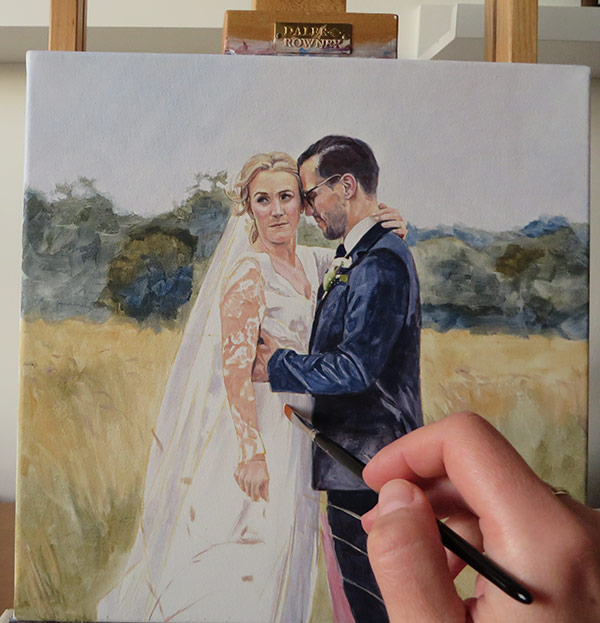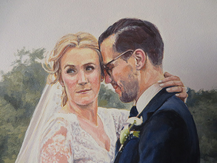 This is a 30 x 30 cm wedding painting. I worked on the portrait in September. It was commissioned as a wedding present for the couple in the picture. I loved the setting of the photo, the colours work really well. I had a few photographs to work from for the portrait. I used acrylic on stretched fine grain cotton canvas. The client was very pleased with the finished painting. I took some photos that I am including together with the scan.